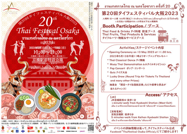 TSP太陽株式会社(本社:東京都目黒区、代表取締役社長 池澤 嘉悟、以下「当社」)が共催する「第20回タイフェスティバル大阪2023」を、2023年5月13(土)・14日(日) 10:00~21:00に京橋駅前特設会場にて開催いたします。
