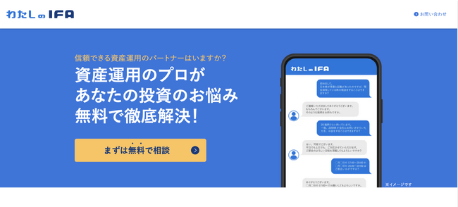 「わたしのIFA」は、IFAと投資家を結ぶ新たなマッチングサービスであり、IFAが求める投資家と、投資家が求めるIFA、双方の希望条件を基に投資家にマッチするアドバイザー(IFA)を提示し、希望するアドバイザーを投資家様ご自身で選んでいただけるという特徴があります。アドバイザーは得意な分野、得意な顧客層など持っており、当社は様々なアドバイザーをご紹介することが可能です。