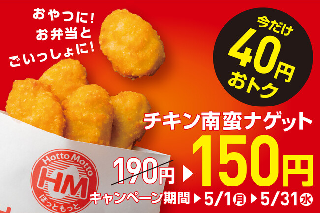 株式会社プレナスは、持ち帰り弁当の「Hotto Motto (ほっともっと)」を、2023年3月末現在、2,451店舗展開しております。このたび「ほっともっと」では、人気のサイドメニュー『チキン南蛮ナゲット』が40円引きになる『チキン南蛮ナゲットキャンペーン』を5月1日(月)~5月31日(水)の期間限定で実施いたします。チキン南蛮が一口サイズになった『チキン南蛮ナゲット』は、お弁当にプラス一品や、小腹が空いた際のおやつなどに最適な商品です。ぜひこの機会にお試しください。