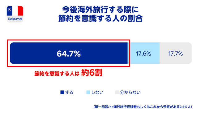 「直近1年で海外旅行をした」「これから予定がある」「直近1年で海外旅行をし、これから予定もある」と回答した2,617人に、「今後海外旅行をする際、節約を意識するかどうか」(単一回答)について質問したころ、「意識する」(64.7%)が最多、次いで「意識しない」(17.6%)「分からない」(17.7%)という結果になりました。