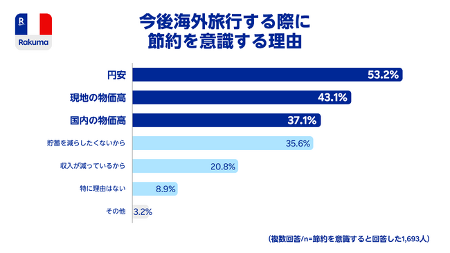 「今後海外旅行をする際、節約を意識する」と回答した1,693人に、「節約を意識する理由」(複数回答)について質問したところ、「円安」(53.2%)が最多、次いで「現地の物価高」(43.1%)「国内の物価高」(37.1%)という結果になりました。