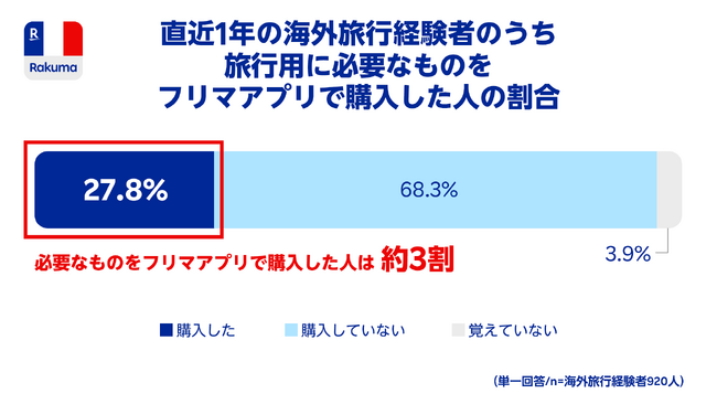 「海外旅行をした」「海外旅行をし、これから予定もある」と回答した直近1年での海外旅行経験者920人に、「旅行用に必要なものをフリマアプリで購入したか」(単一回答)について質問したところ、「購入した」(27.8%)、「購入していない」(68.3%)、「覚えていない」(3.9%)という結果になりました。