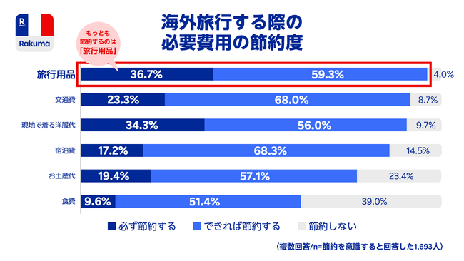 また、「意識する」と回答した1,693人に、「海外旅行する際の必要費用の節約度」(単一回答)について質問したところ、「旅行用品」に対して合計96.0%が「必ず節約する」(36.7%)「できれば節約する」(59.3%)と答え、「旅行用品」への節約度が最も高いことが分かりました。一方、最も節約度が低いのは「食費」となりました。