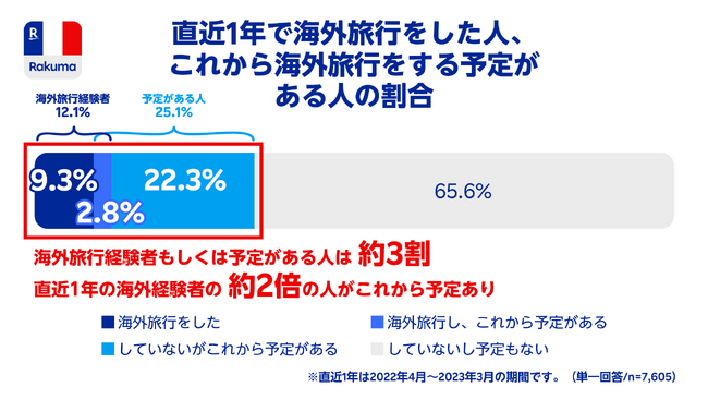 (注2)直近1年の海外旅行経験者(9.3%)と、直近1年で海外旅行をし、これから予定もある人(2.8%)の合計12.1%と、直近1年で海外旅行をし、これから予定もある人(2.8%)と直近1年で経験はないがこれから予定がある人(22.3%)の合計25.1%で比較しています。