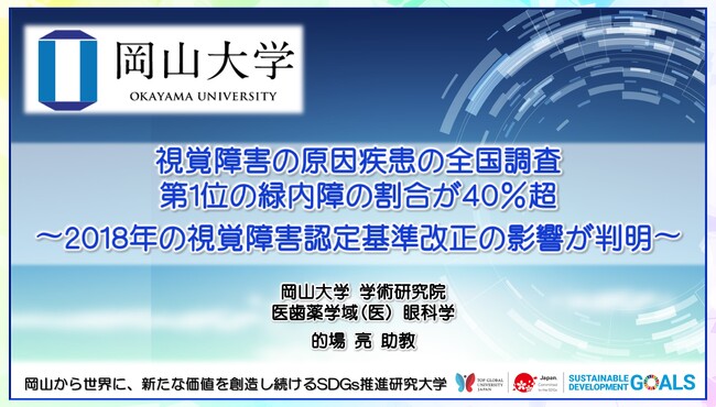 【岡山大学】視覚障害の原因疾患の全国調査 第1位の緑内障の割合が40%超 ~2018年の視覚障害認定基準改正の影響が判明~
