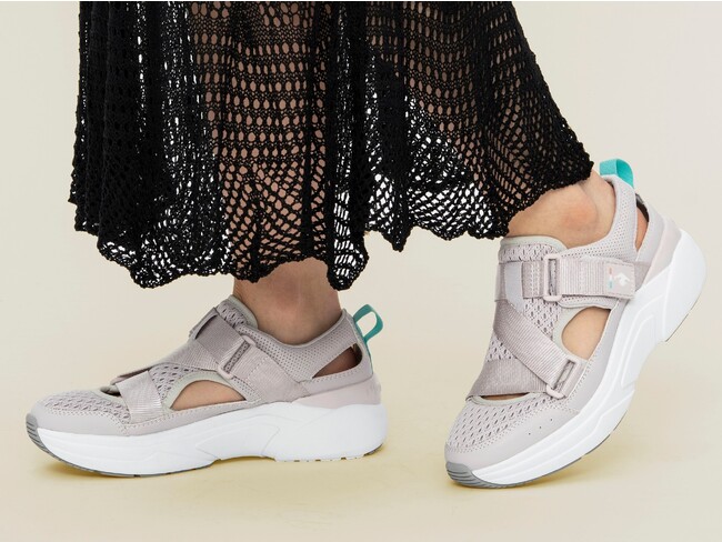 スニーカーのソールをそのまま使用した厚底ソールのクッション性と、ベルトで調整できるフィット感で、夏に向けて増えるキャンプやバーベキュー、野外フェスなどのアウトドアアクティビティや、歩くことの多いお出かけにもぴったり。また、アッパー部分にはメッシュ素材を、素肌に触れるライニング部分には接触涼感素材を使用、また、消臭機能のあるインソールを採用しているので、夏の足元を快適にします。