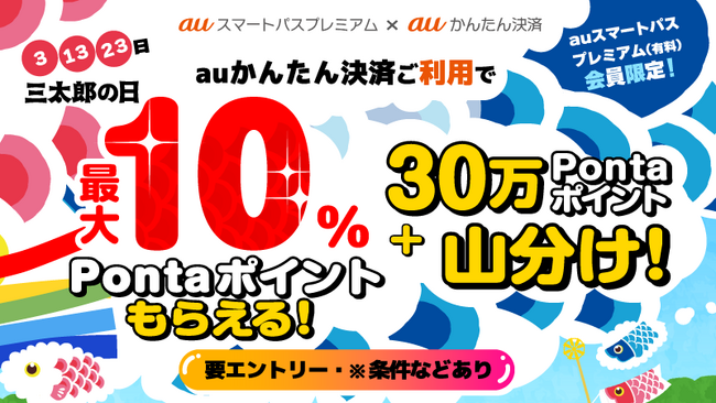2023年4月に引き続き5月も、「三太郎の日」に「auかんたん決済」を利用すると、Pontaポイントがもらえるキャンペーン(※)を、 auスマートパスプレミアム会員限定で実施します。※ 一部のサービスは対象外となります。