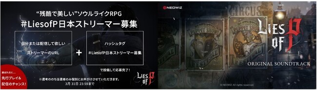 株式会社NEOWIZ (本社:韓国 京畿道城南市、共同代表:金 承徹(キム・スンチョル)/裵 泰根(ベ・テグン)) は2023年8月発売予定の『Lies of P』におきまして、日本国内限定の“『Lies of P』公認インフルエンサーオーディション”を実施し、本日4月28日(金)に公認インフルエンサーの第一陣となる2名を選出いたしました。