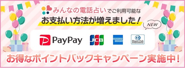 これまでご利用可能だったクレジットカードのVISA、Mastercardに加え、JCB、アメリカン・エキスプレス、Diners、さらにキャッシュレス決済サービスのPayPayもご利用可能になりました。これを記念して、期間中にキャッシュレス決済 (クレジットカード全種、PayPay、Amazon Pay)をご利用の方に、ポイントバックキャンペーンを開催!ぜひこの機会にお得に電話占いをご利用ください。