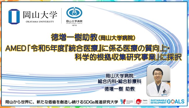 国立大学法人岡山大学(本部:岡山市北区、学長:那須保友)の岡山大学病院総合内科・総合診療科の徳増一樹助教が、国立研究開発法人日本医療研究開発機構(AMED)の「令和5年度『統合医療』に係る医療の質向上・科学的根拠収集研究事業」に採択されました。