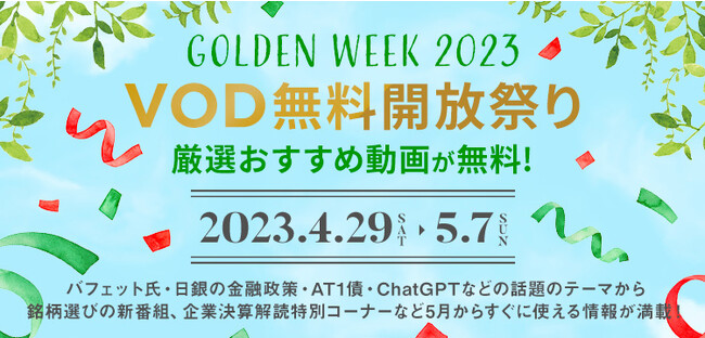 株式会社日経CNBC(本社:東京都千代田区、代表取締役社長:竹之内源市、以下「日経CNBC」)は2023年4月29日(祝・土)から5月7日(日)までの期間に、「ゴールデンウィーク2023 VOD無料開放祭り」として厳選したマーケット解説動画を無料公開いたします。