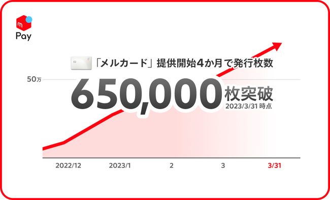 株式会社メルペイ(以下、メルペイ)は、2022年11月8日より、「メルカリ」の利用実績等で限度額が決まり、アプリで利用と管理が完結するクレジットカード「メルカード」の提供を開始し、すべてのお客さまが申込可能となってから(2022年12月1日)、4か月(※2)でカード発行枚数65万枚を突破したこと、お知らせいたします。