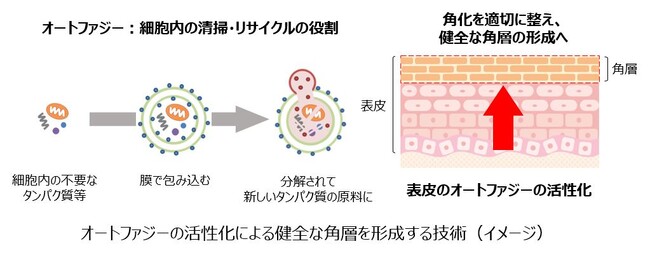 花王株式会社(社長・長谷部佳宏)生物科学研究所は、オートファジーの活性が低下することにより、表皮の恒常性が損なわれ、皮膚の潤いやバリア機能を担う角層の形成(角化)が乱れることを明らかにしました。さらには、オートファジーの活性を高めることで、表皮角化の恒常性が維持される可能性が示されました。その結果に基づき、オートファジーの活性を高めることで、表皮角化を促進させる有望な植物エキスを見いだしました。