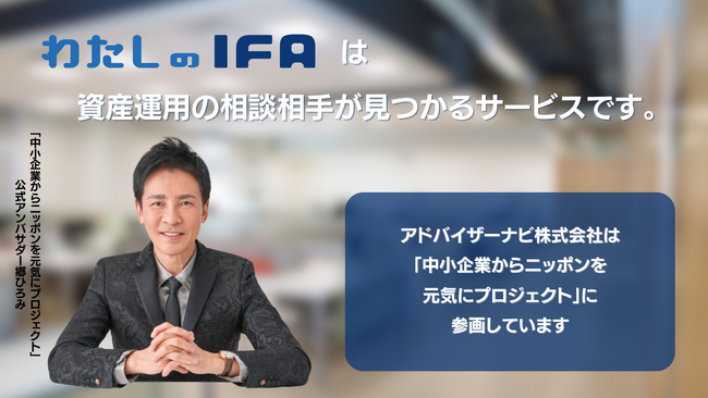 投資家とIFAのマッチング事業・人材紹介業・IFAのコンサルティング事業を運営するアドバイザーナビ株式会社(所在地:中央区日本橋、代表取締役:平 行秀、以下当社)は、2023年4月より「中小企業からニッポンを元気にプロジェクト」第5期に参画しており、今後同プロジェクトの公式アンバサダー郷ひろみさんの広告素材を用いたプロモーションを開始します。