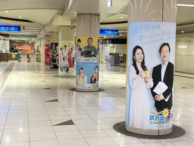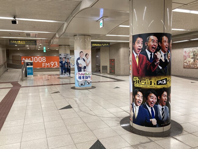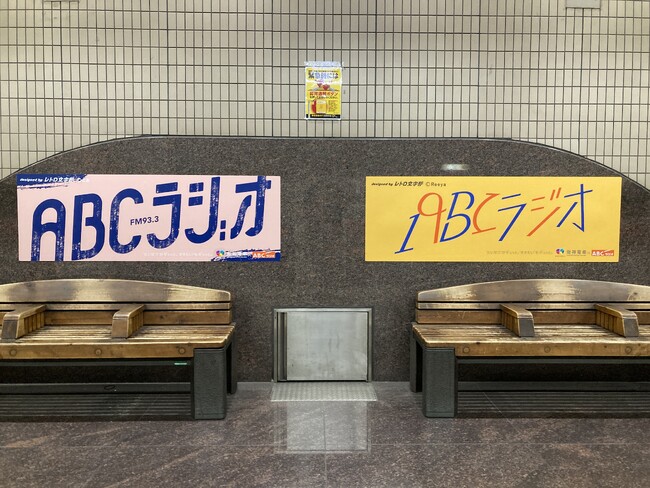 さらに改札階にはABCラジオの番組ポスタービジュアルを装飾。色とりどりなポスターがずらりと並ぶ。