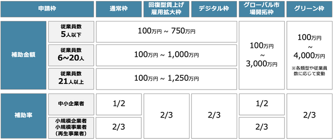 事業者による、「新商品/新サービスの開発提供」「生産/製造プロセスの改善」「サービス提供方法の改善」 を目的として、機械装置やシステム開発などの設備投資を支援する、ものづくり補助金の基本的な申請枠。