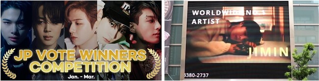 2023年4月11日(火)から4月17日(月)までの期間で開催した、「日本決勝投票 1~3月のベストアイドルを選ぼう!」の投票において1位に選ばれたBTSのジミンさんの応援広告が、新大久保のK-PLAZA 1号館の屋外ビジョン及び大阪梅田駅BIGMANで上映されます。