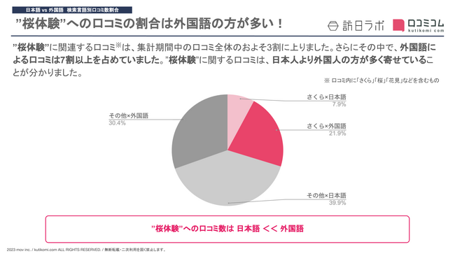 ”桜体験”に関連する口コミ※は、集計期間中の口コミ全体のおよそ3割に上りました。さらにその中で、外国語による口コミは7割以上を占めていました。