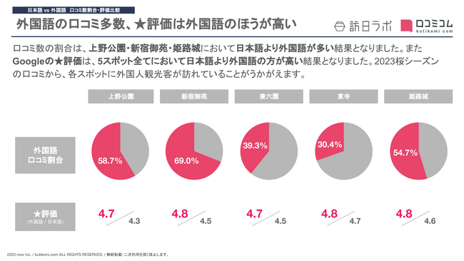 口コミ数の割合は、上野公園・新宿御苑・姫路城において日本語より外国語が多い結果となりました。またGoogleの★評価は、5スポット全てにおいて日本語より外国語の方が高い結果となりました。