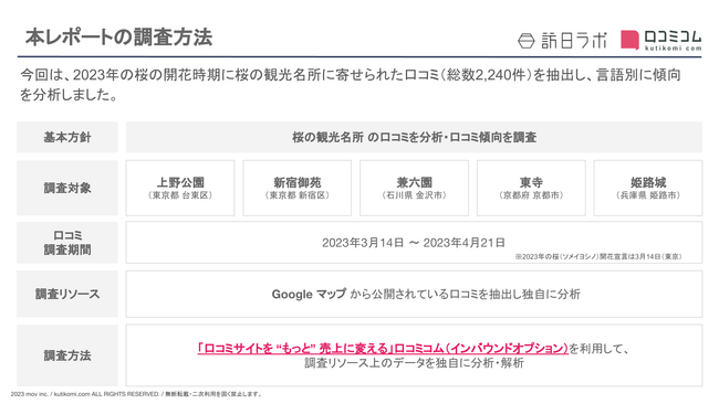 今回は、2023桜シーズンに国内のお花見スポット5箇所(上野公園/新宿御苑/兼六園/東寺/姫路城)に寄せられた口コミ(総数2,240件)を抽出し、言語別に傾向を分析しました。
