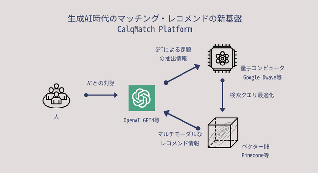 「CalqMatch」は、OpenAI GPT-4の圧倒的な自然言語処理能力とPinecone等ベクターDB、そしてGoogle Dwave等による量子アニーリング技術を利用して、衣食住に関わる業界からビジネスやプライベートなど様々なシーンでのニーズに対応したマッチングを行うことを目指しています。これにより、従来のマッチングプラットフォームでは対応できなかった幅広いニーズに対応し、高いパーソナライズ性を兼ね備えたマッチングサービスを提供します。