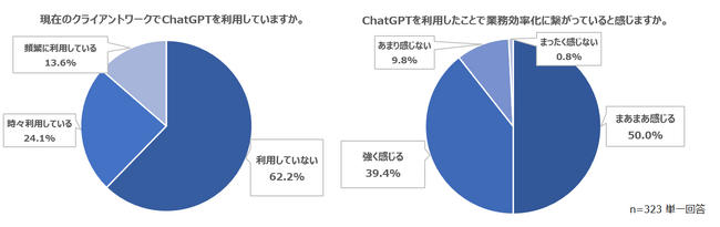 「現在のクライアントワークにChatGPTを利用していますか」という質問に対しては、4割の人が利用していると回答しました。「頻繁に利用している」と答えた人は13.6%で、現状ではまだ業務に浸透している段階ではないといえます。一方で、ChatGPTを利用した約9割の人が業務効率化につながっていると感じており、一度利用した人は継続的に利用するのではないかと考えられます。