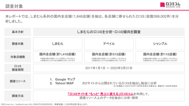 本レポートでは、しまむら系列の国内全店舗(1,846店舗)を抽出、各店舗に寄せられた口コミ(総数399,002件)を分析しました。