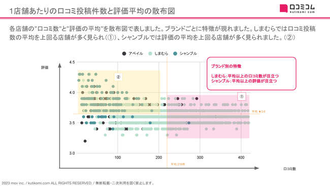 各店舗の”口コミ数”と”評価の平均”を散布図で表しました。ブランドごとに特徴が現れました。しまむらでは口コミ投稿数の平均を上回る店舗が多く見られ(1.)、シャンブルでは評価の平均を上回る店舗が多く見られました。(2.)