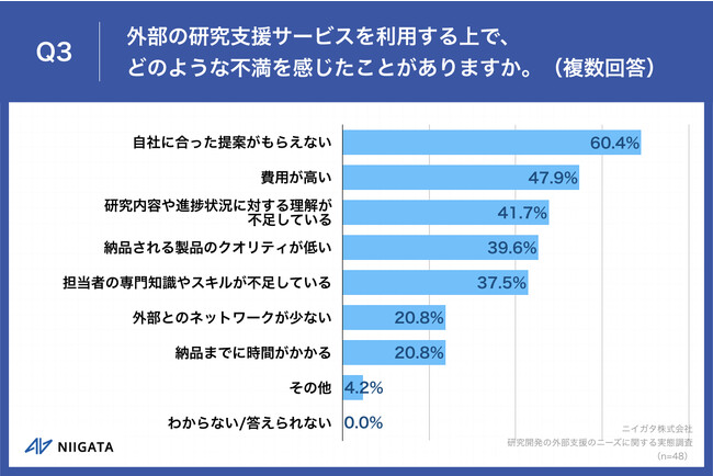Q2で「かなりある」「ややある」と回答した方に、「Q3.外部の研究支援サービスを利用する上で、どのような不満を感じたことがありますか。(複数回答)」(n=48)と質問したところ、「自社に合った提案がもらえない」が60.4%、「費用が高い」が47.9%、「研究内容や進捗状況に対する理解が不足している」が41.7%という回答となりました。