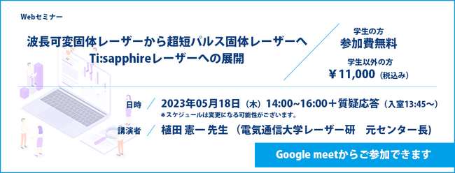 (2023/05月18日(木)14:00~開催)波長可変固体レーザーから超短パルス固体レーザーへ Ti:sapphireレーザーへの展開 / Webセミナー開催についてのお知らせ