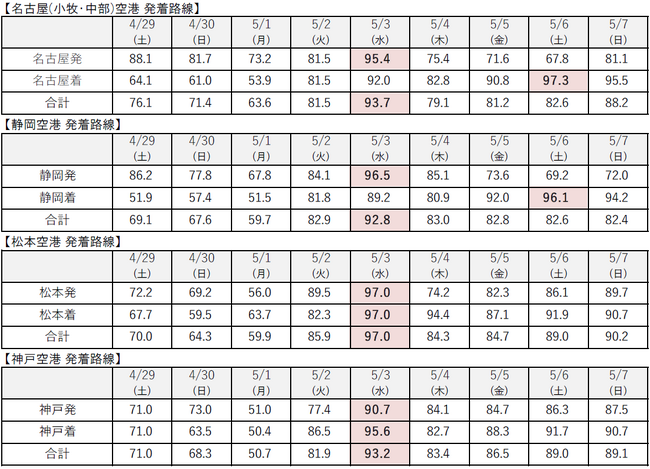 ■ 日別の搭乗率(単位:%)※ピーク日は太字で記載