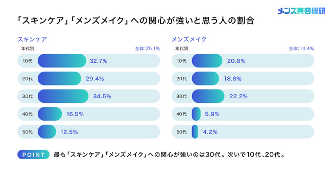 【第2回 メンズ美容定点調査】「メンズ美容への関心度」が最も高いのは30代!? 「実施率」は10代が最多 約半数は「メンズメイクは世の中に受け入れられている」と回答、昨年比でも微増