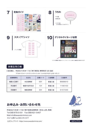 徳島の伝統文化である「阿波おどり」を次世代に、そして未来へつないでいき、持続可能な阿波おどりを創り上げるとともに、今後も多くの方に阿波おどりを楽しんでいただくため、一人でも多くの皆様のご協力をお願いします。