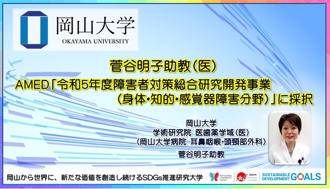 国立大学法人岡山大学(本部:岡山市北区、学長:那須保友)の学術研究院医歯薬学域(岡山大学病院耳鼻咽喉・頭頸部外科)の菅谷明子助教が、国立研究開発法人日本医療研究開発機構(AMED)の「令和5年度障害者対策総合研究開発事業(身体・知的・感覚器障害分野)」に採択されました。