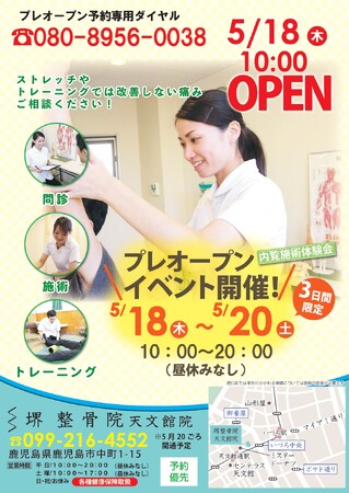 【堺整骨院 天文館院 プレオープンのポスター】