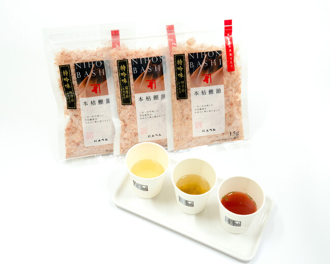 シンプルな伝統のかつお節だし、かつお節と昆布の合わせだし、かつお節だしのイメージを変えるトマト仕立ての3種を飲み比べて、おだしの奥深さをご賞味ください。