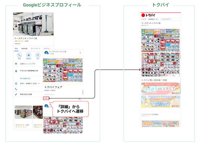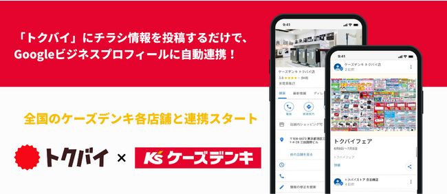 この度、株式会社ケーズホールディングスが展開する「ケーズデンキ」全550店舗に本サービスを導入いただきました。これによりケーズデンキは、「トクバイ」に入稿したチラシ情報を「Googleビジネスプロフィール」にも自動で掲載し、追加工数をかけることなく生活者へ最新の特売情報を届けることができるようになります。