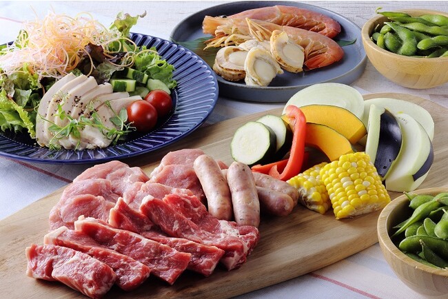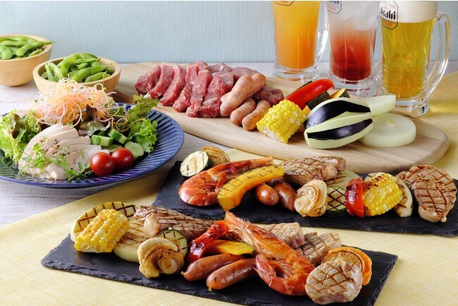 「スモークチキンとミックスサラダ」などの前菜からスタート。焼き物プレートにはオーストラリア産牛ロース肉、ポークフィレ肉、ソーセージのジューシーなお肉と、プリプリとした帆立貝や有頭えびのシーフード、カラフルな野菜をバランスよく組み合わせました。食欲をそそる音や香りとともに、焼きたてを堪能していただけます。