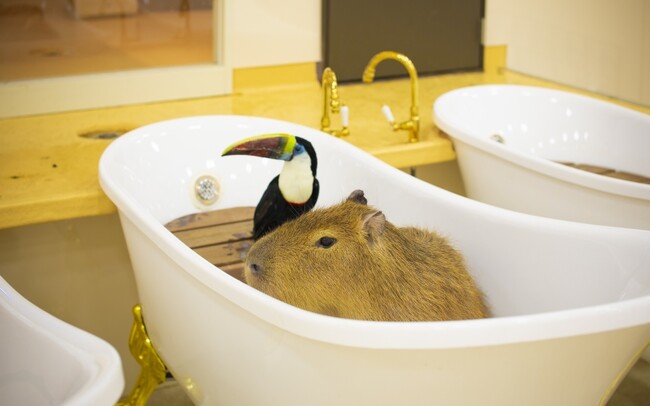 伊豆シャボテン動物公園で大人気の「カピバラの露天風呂」がラグジュアリーな“カピバラの猫足風呂”に変わり、見た目も華やかで癒し効果もある愛らしいカピバラの姿をみることができます。