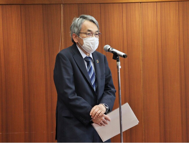 那須学長は「岡山大学では大学院博士後期・博士課程の学生のみなさんを学生ではなく、研究者の一員とみなし、挑戦的研究に取り組めるように研究環境を整備しています。私自身も大学院生時代に多くの経験をし、その中には辛く困難なこともありましたが、多くの支えを頂いて学位を取得することができました。今日、認定を受けたみなさんも研究者としてさまざまなことが待ち受けていると思います。時代に対応しながら、『未来のあるべき姿』を常に念頭に置き、柔軟に変えて行く、変わって行くものと変えずにしっかりと自分自身の中に持ち続けるもの『不易流行』を胸にし、我が国の科学技術・イノベーション創出を担う研究活動に日々邁進してください」とあいさつ。次世代を担う若手研究者らを激励しました。