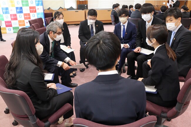 その後、本事業のキャリア面でのメンターを務める本学教育推進機構の町田尚史准教授から今後の予定やキャリアサポートの情報などの紹介が行われた後、認定者は3グループに分かれ、車座での意見交換会を開催。大塚愛二特任教授、町田尚史准教授、佐藤法仁副理事・副学長のファシリテートのもと、那須学長も輪に加わって、各自が自分自身や研究について1分間でプレゼンテーションする「フラッシュ・トーク」を実施し、互いの交流を深めました。