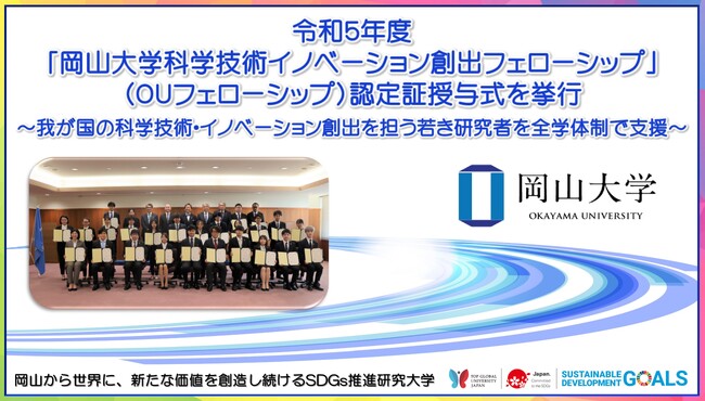 国立大学法人岡山大学(本部:岡山市北区、学長:那須保友)は2023年5月9日、「令和5年度岡山大学科学技術イノベーション創出フェローシップ(通称:OUフェローシップ)認定証授与式」を岡山大学津島キャンパスの本部棟で行いました。