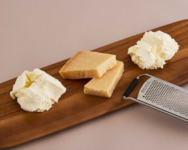 北海道はスイーツの原材料の一大産地。その豊かな恵みをふんだんに使い、チーズ・生クリーム・ビートグラニュー糖は全て北海道産にこだわっています。クリームチーズと、マスカルポーネチーズ、パルメザンチーズの3種類のチーズはもちろん北海道産、酪農王国北海道のおいしさをぎゅっと詰め込みました。