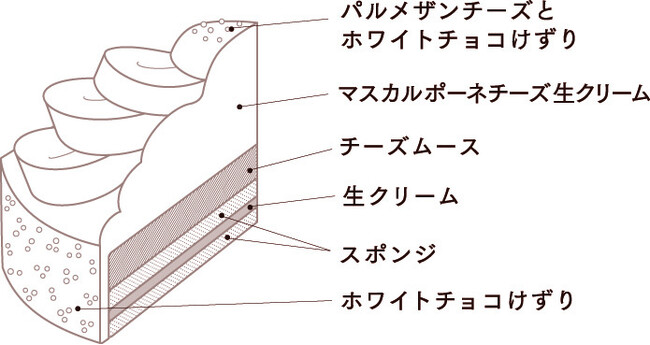 やさしい味わいのチーズムース、甘さ控えめなミルク感溢れるマスカルポーネ生クリーム、ふわふわしっとりスポンジの3層が織りなすチーズの風味とコク、生ケーキの繊細さと軽やかさは、いくらでも食べられる後を引く上品なおいしさです。