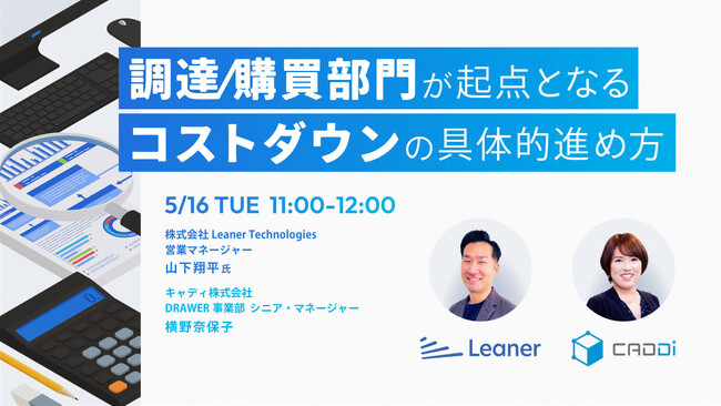本セミナーでは、調達・購買部門の方に向け、図面データ活用クラウド「CADDi DRAWER」を提供するキャディ株式会社と、ソーシングDXクラウド「Leaner見積」を提供する株式会社Leaner Technologiesの2社で、企業のコストダウンに繋がった事例を踏まえ、調達・購買部門の方が中心にコストダウンを進める具体的な進め方についてお伝えします。