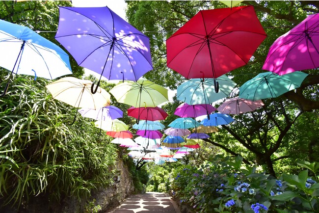 また、今年も「あじさいロード」には傘をあしらった色鮮やかな「アンブレラスカイ」をご用意いたしました。アジサイ、そして雨にも映えるフォトスポット…あじさい苑の各所でこの時期ならではの風雅な記念撮影をお楽しみ下さい。