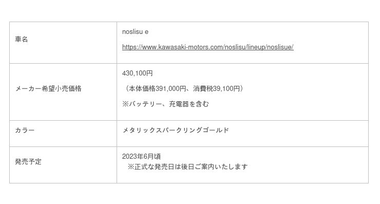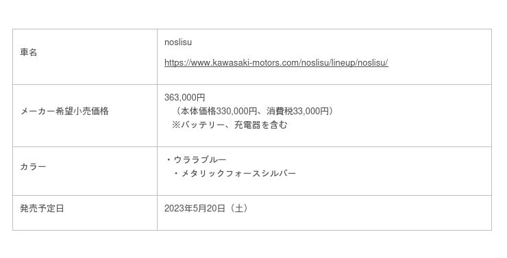 株式会社カワサキモータースジャパン(本社:兵庫県明石市、代表取締役社長:桐野 英子)は、自転車と四輪車のあいだをつなぎ、今までにない安定感と快適さ、操る楽しさを提供するパーソナルビークル「noslisu」シリーズを5月20日より順次発売いたします。シリーズには、電動アシスト自転車仕様「noslisu」、ペタル操作無しで走行可能なフル電動仕様(※要普通自動車運転免許)「noslisu e」、大容量カーゴスペースを特長とする電動アシスト自転車仕様「noslisu cargo」の3タイプを用意しニーズに合わせてお選びいただけます。