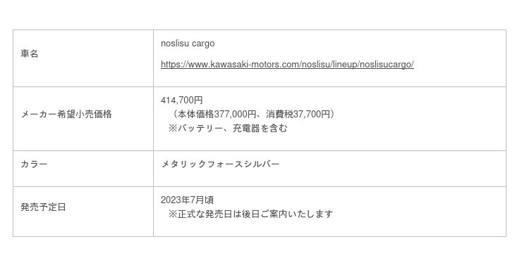 カワサキ 電動3輪ビークル「noslisu」「noslisu e」「noslisu cargo」を発売
