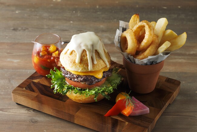 雪化粧した富士山に見立てたチーズフォンデュを掛けたオリジナルブリオッシュバンズに、「甲州ワインビーフ」100%パティと「甲州富士桜ポーク」ベーコン、山梨県産トマトなどを贅沢に挟んだバーガー。味変をお楽しみただけるよう、たっぷりの夏野菜とデスソースで仕上げた辛口ラタトゥーユソースを添えてご提供します。