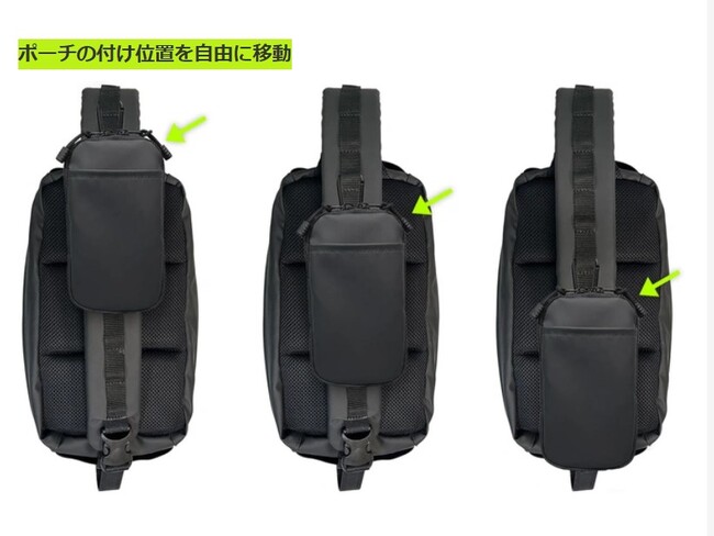 2:脱着可能で、ショルダーの好きな位置に設置が可能なスマホポーチ付属